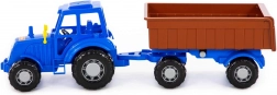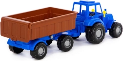 Tractorul este construit pe axe metalice, care asigură stabilitate și mișcare lină. Remorca este detașabilă și potrivită pentru transportul obiectelor mici. Plasticul de calitate rezistă utilizării zilnice și garantează durabilitatea jucăriei.