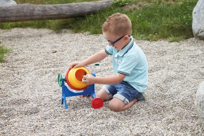 Copiii pot amesteca cu adevărat conținutul rotind tamburul cu ajutorul manivelei laterale – joc realist ca pe șantier.