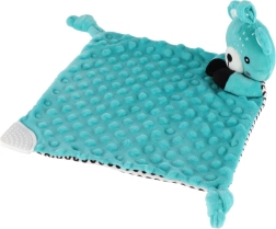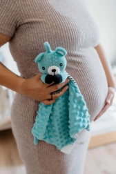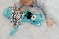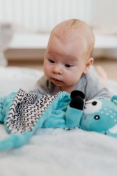 Unul dintre colțurile păturicii este completat cu un mușcător moale din silicon, care alină gingiile sensibile. Nodurile din colțuri sunt ușor de apucat de mânuțele mici și susțin dezvoltarea motricității fine. Produsul este certificat în Cehia și respectă standardele de siguranță pentru nou-născuți.