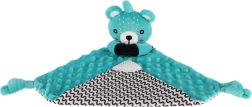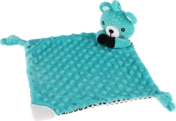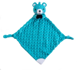 Păturică de alint moale cu cap de ursuleț adorabil din minky fin cu puncte 3D oferă bebelușului un sentiment de siguranță, liniște la adormire și o stimulare senzorială delicată. În interiorul ursulețului se află o zornăitoare discretă pentru susținerea auzului, iar pe colț un mușcător moale din silicon pentru alinarea erupției dentare.
