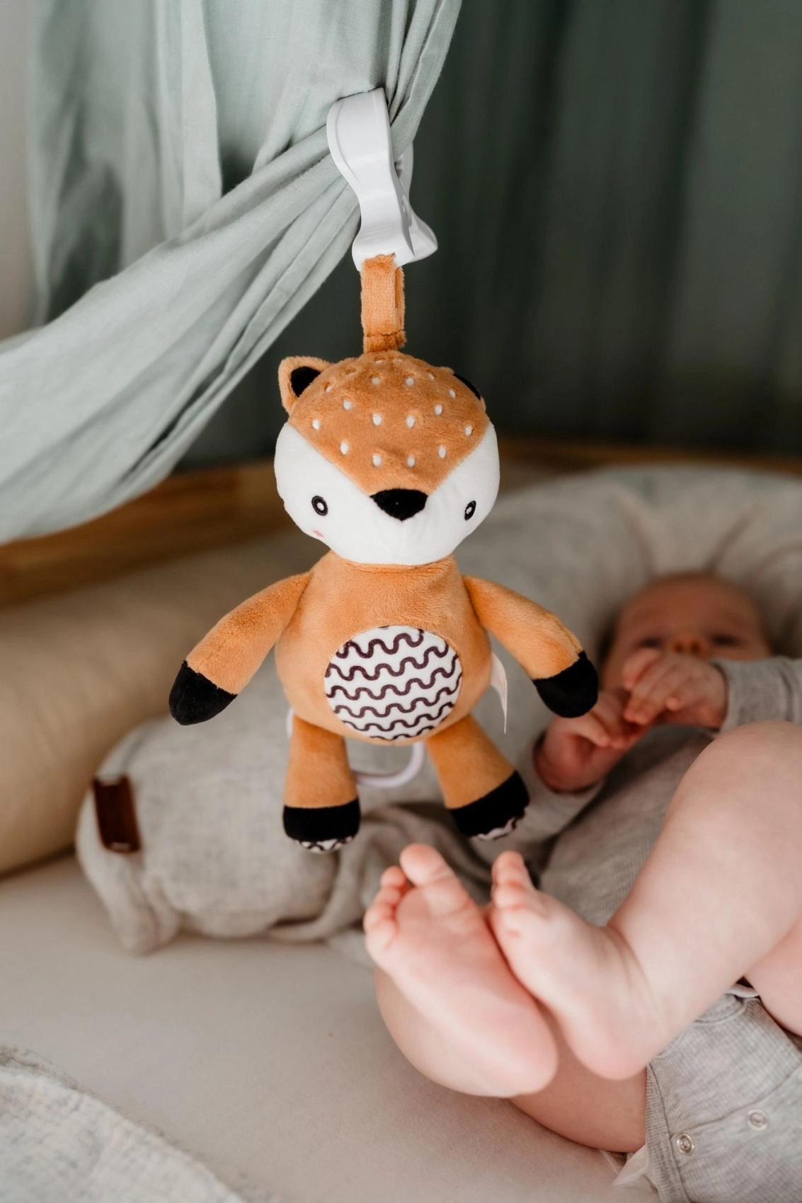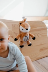 Căprioara de pluș suspendată este însoțitorul ideal acasă și în călătorii. Materialul moale invită la atingeri și îmbrățișări, în timp ce zornăitoarea din interiorul trupului captează delicat atenția bebelușului și ajută la dezvoltarea simțurilor sale. Datorită clemei universale, jucăria se fixează ușor pe cărucior, pătuț, scaun auto sau bară de joacă.