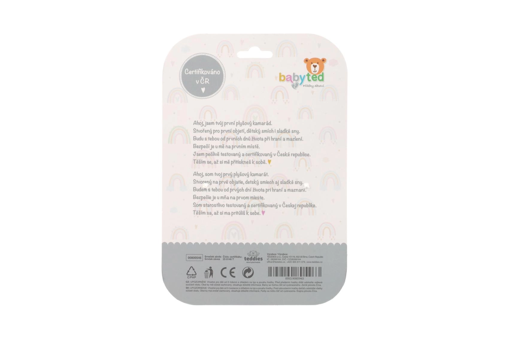 La capetele mâinuțelor vei găsi forme de steluță și floricică, care susțin prinderea, coordonarea mână-ochi și pot servi și ca elemente sigure pentru dentiție. Jucăria este certificată în Cehia, îndeplinind standardele stricte de siguranță pentru copii de la 0 luni.