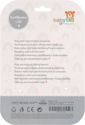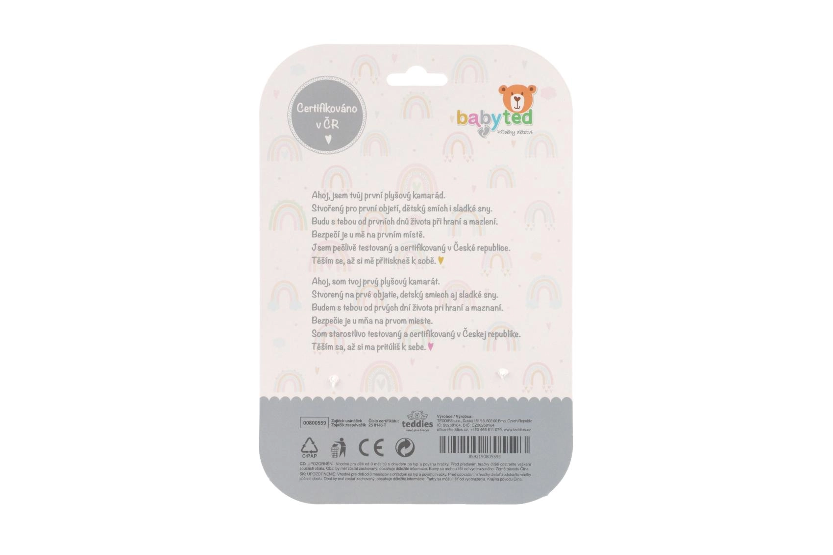În interior se află o zornăitoare delicată pentru dezvoltarea auzului, într-un colț un inel de dentiție din silicon moale pentru alinarea gingiilor dureroase, iar nodurile din colțuri susțin motricitatea fină. Dimensiunea practică de 25 × 25 cm este ideală pentru pătuț, cărucior și scaun auto.