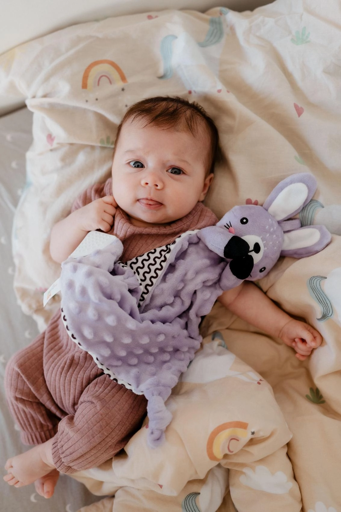 Această păturică de somn pufoasă, în formă de iepuraș, este primul prieten ideal pentru bebeluși. Materialul minky cu buline 3D în relief oferă o stimulare tactilă plăcută, liniștește și ajută la crearea unui sentiment de siguranță atât la somn, cât și pe parcursul zilei. Datorită construcției ușoare, poate fi prinsă cu ușurință chiar și de mânuțele mici.