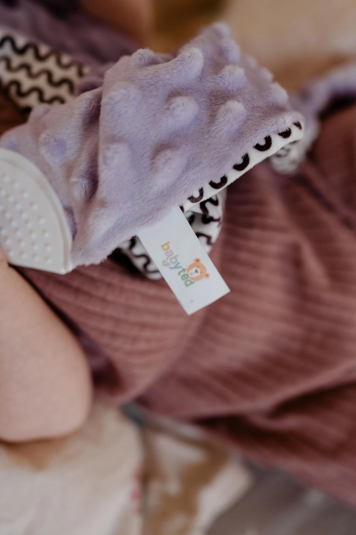 Inelul moale de dentiție dintr-un colț al păturicii alină disconfortul în timpul erupției primilor dinți și susține motricitatea orală.