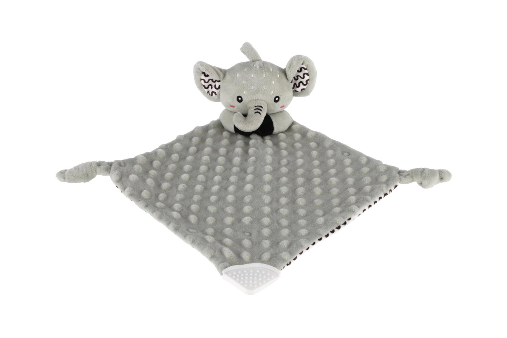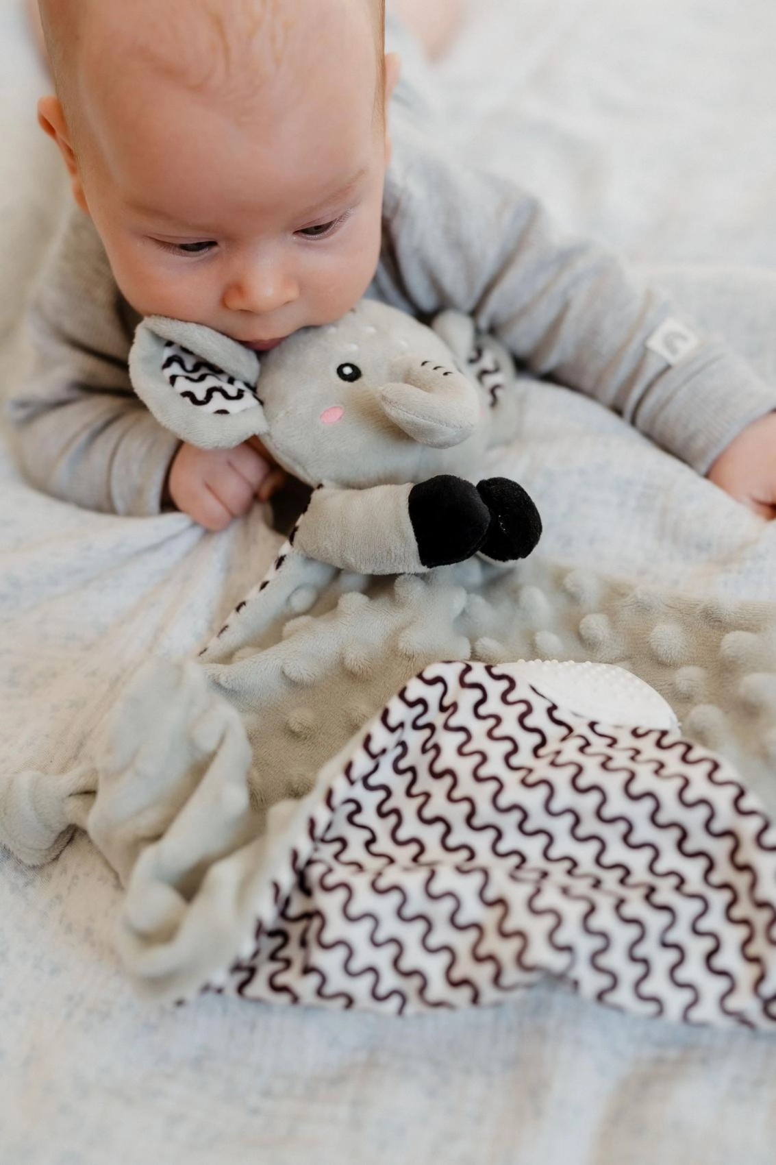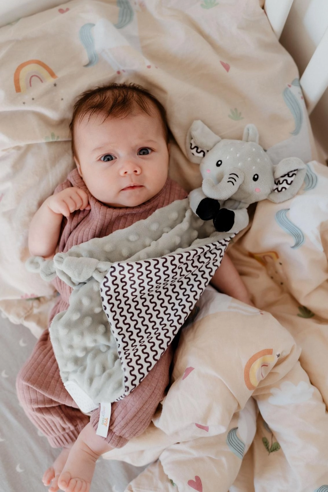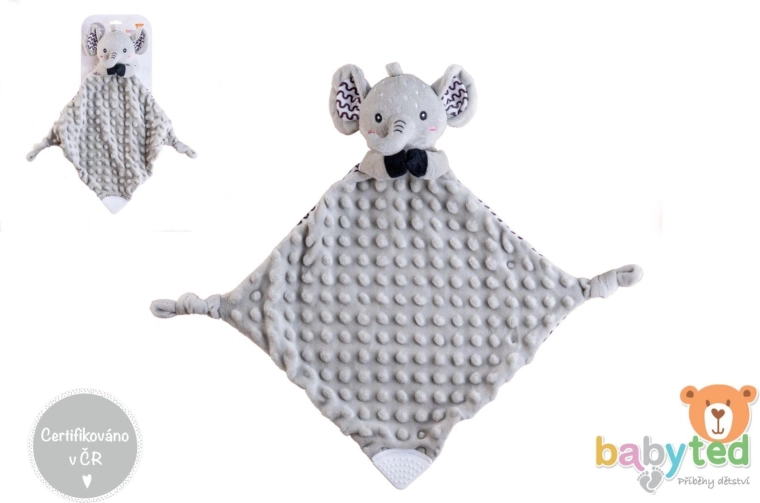 Păturica de alint moale în formă de elefănțel de la BABYTED oferă bebelușului senzație de siguranță și un somn liniștit. Materialul minky foarte moale, cu buline 3D, invită la alint, iar zornăitoarea fină ascunsă dezvoltă auzul. Suzeta de dentiție din silicon, moale, calmează gingiile în perioada erupției dentare. Potrivită de la naștere, certificat în Cehia.