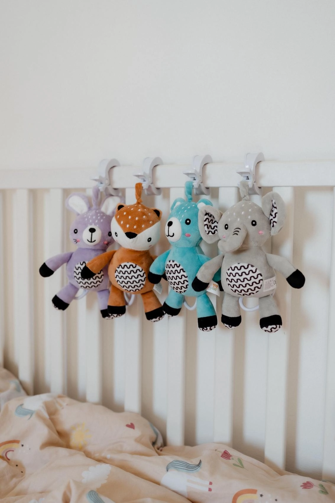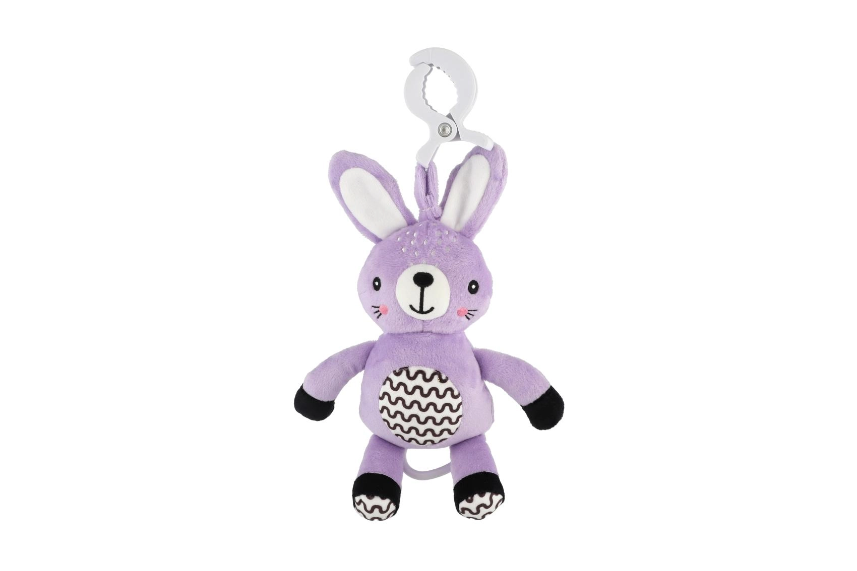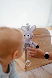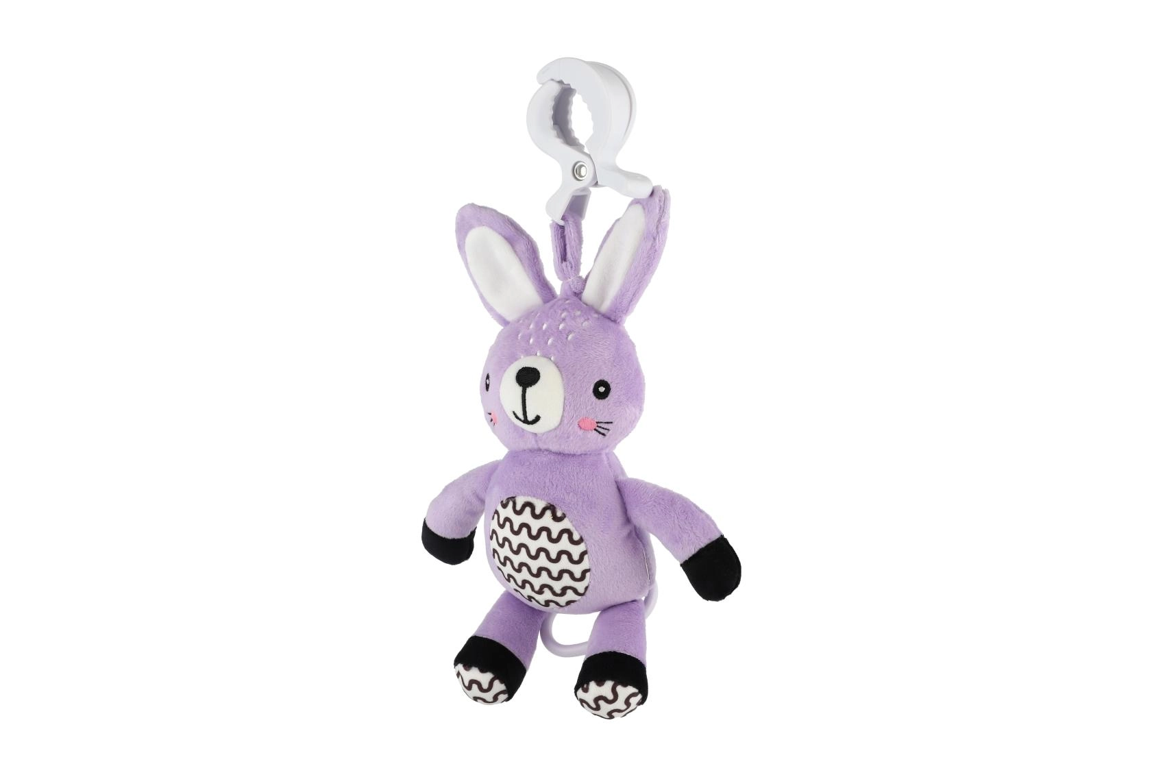 Clipsul practic permite fixarea rapidă a iepurașului de cărucior, pătuț, scaun auto sau bară de jucării – mereu la îndemână acasă și în călătorii.