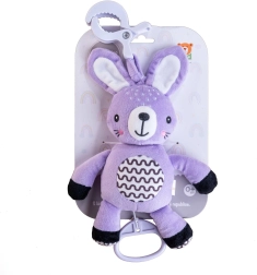 Acest iepuraș din pluș pentru agățat aduce bebelușului confort, stimulare delicată și distracție sigură, acasă sau în mișcare. Mecanismul cu tragere redă o melodie plăcută, care ajută la crearea unui mediu liniștit pentru odihnă. Datorită clipsului universal, jucăria se prinde ușor de cărucior, pătuț, scaun auto sau bară de jucării.