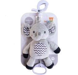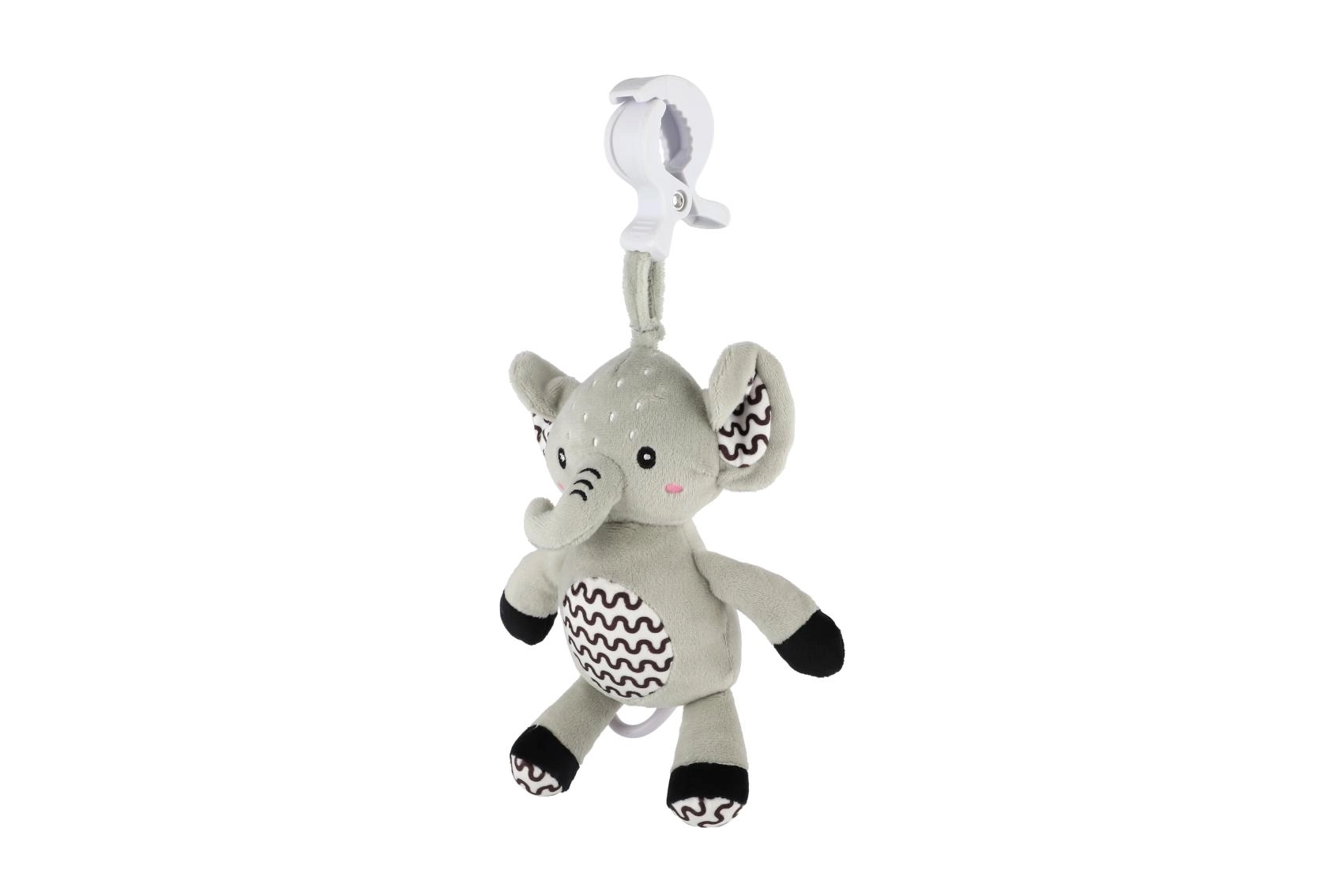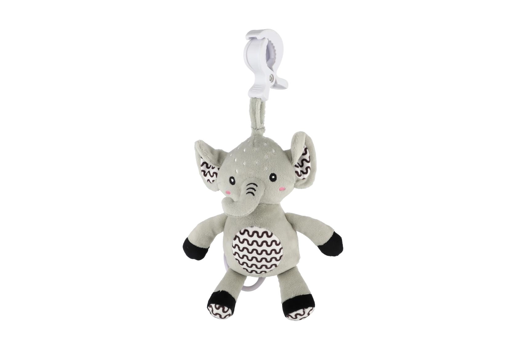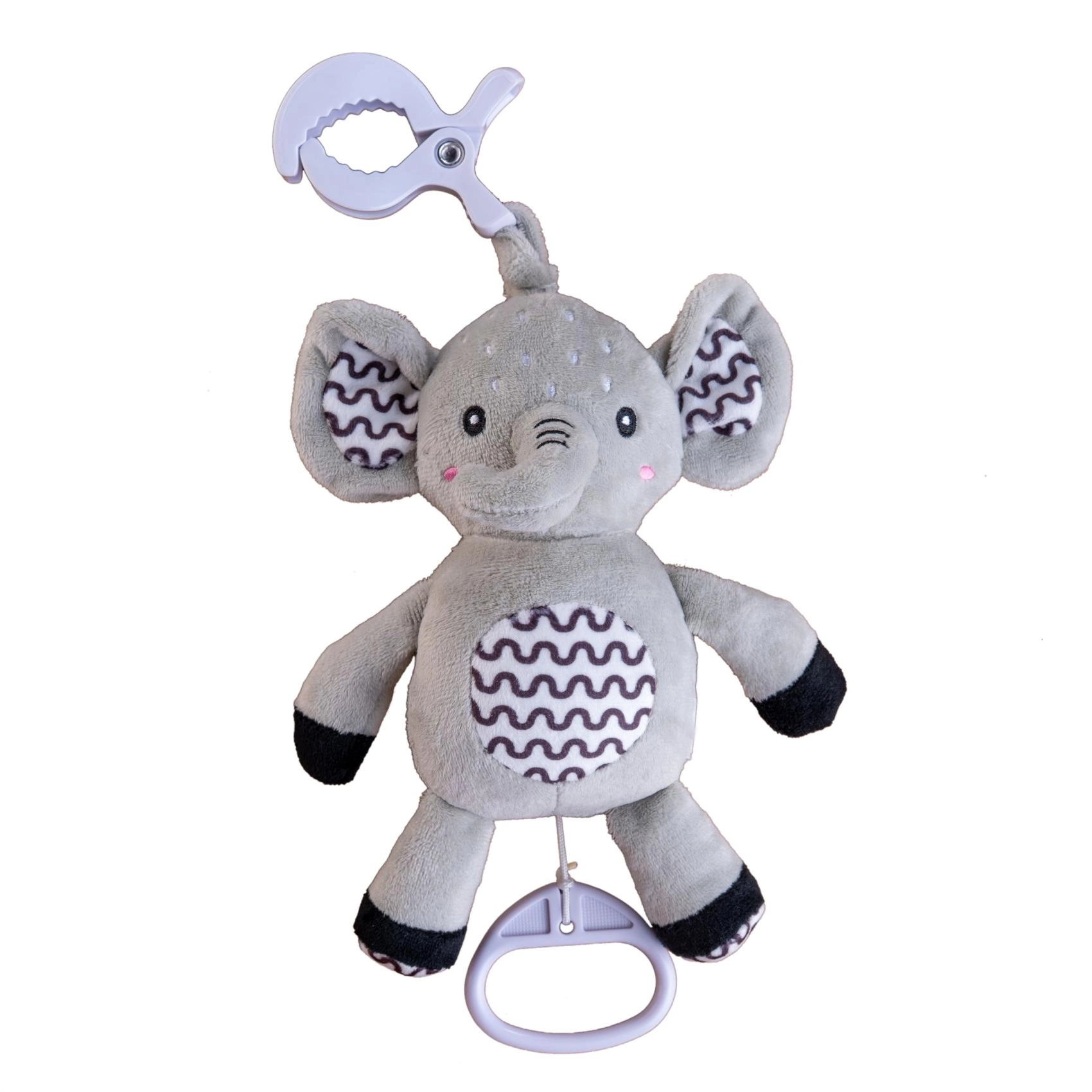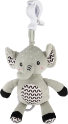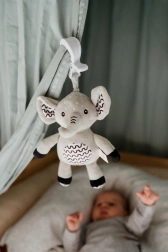 Acest elefant foarte moale este jucăria ideală pentru bebeluși. La tragerea de inel pornește o melodie blândă și liniștitoare, care ajută la calmare și la adormire mai ușoară. Datorită clipsului rezistent pentru agățare îl poți prinde de pătuț, cărucior, scaun auto sau bară de joacă – astfel micuțul are mereu prietenul aproape.