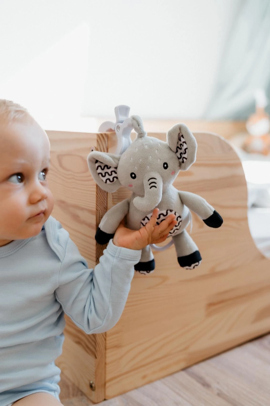 Elefantul este confecționat din pluș catifelat, sigur, potrivit pentru nou-născuți. Modelele contrastante alb-negru de pe urechi și burtică susțin dezvoltarea vederii și atrag interesul încă de la naștere. Detaliile brodate, fără piese mici detașabile, sporesc siguranța la joacă.