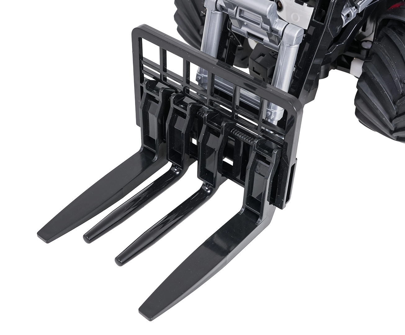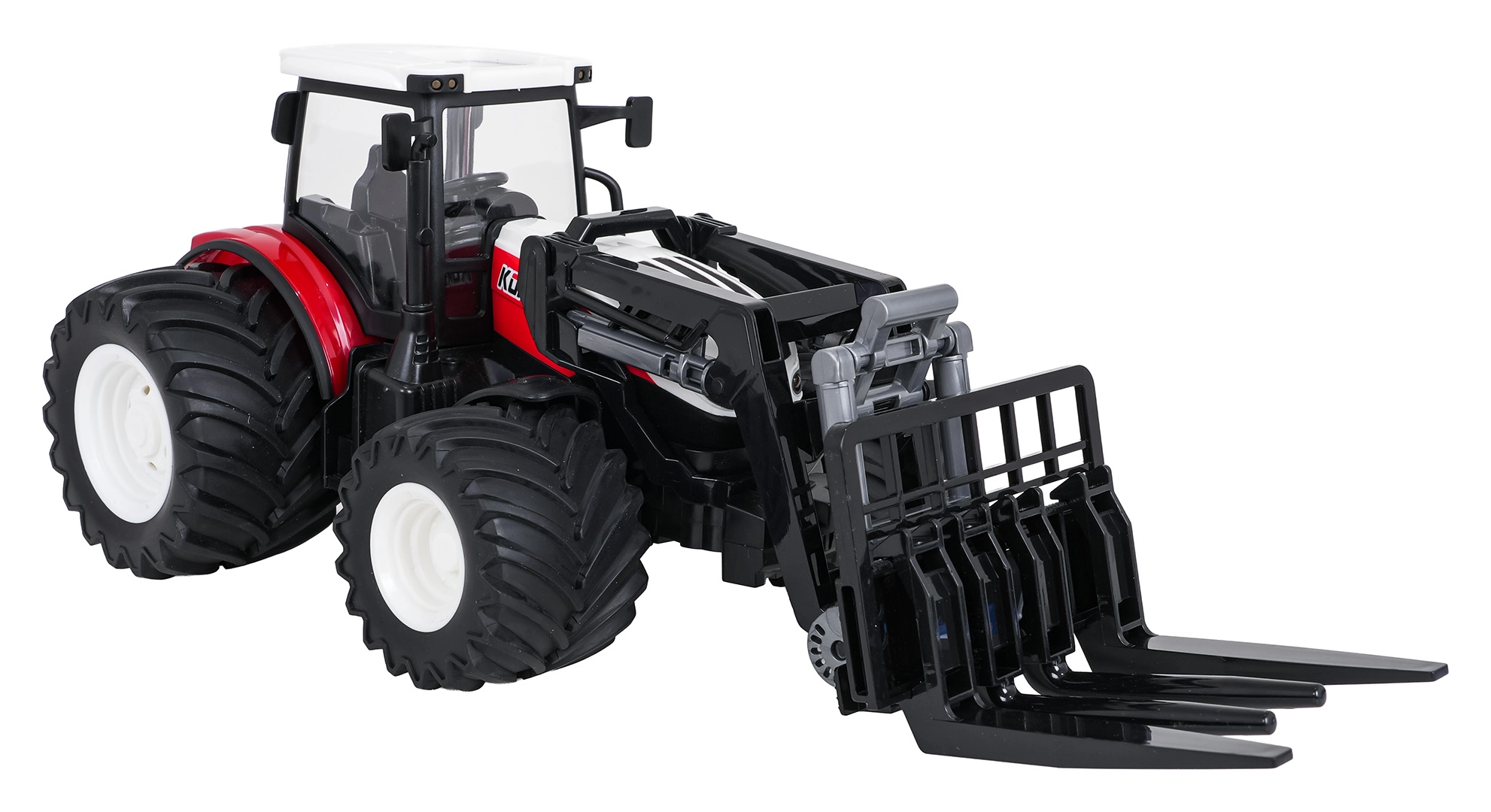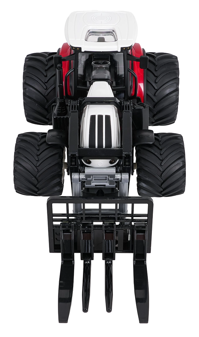Încărcătorul frontal poate fi ridicat, coborât și înclinat manual, astfel încât copiii pot încărca și transporta obiecte mici. Roțile mari din cauciuc asigură tracțiune bună pe diverse suprafețe. Practică este și oprirea automată după o perioadă mai lungă de inactivitate. Tractorul este alimentat de acumulatorul inclus de 3,7 V 500 mAh, încărcarea se face prin cablu USB; telecomanda necesită 2× AAA (neincluse).
