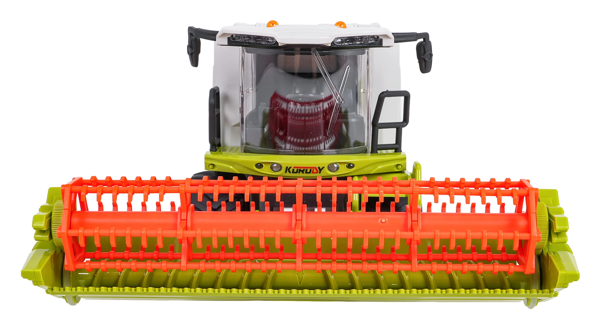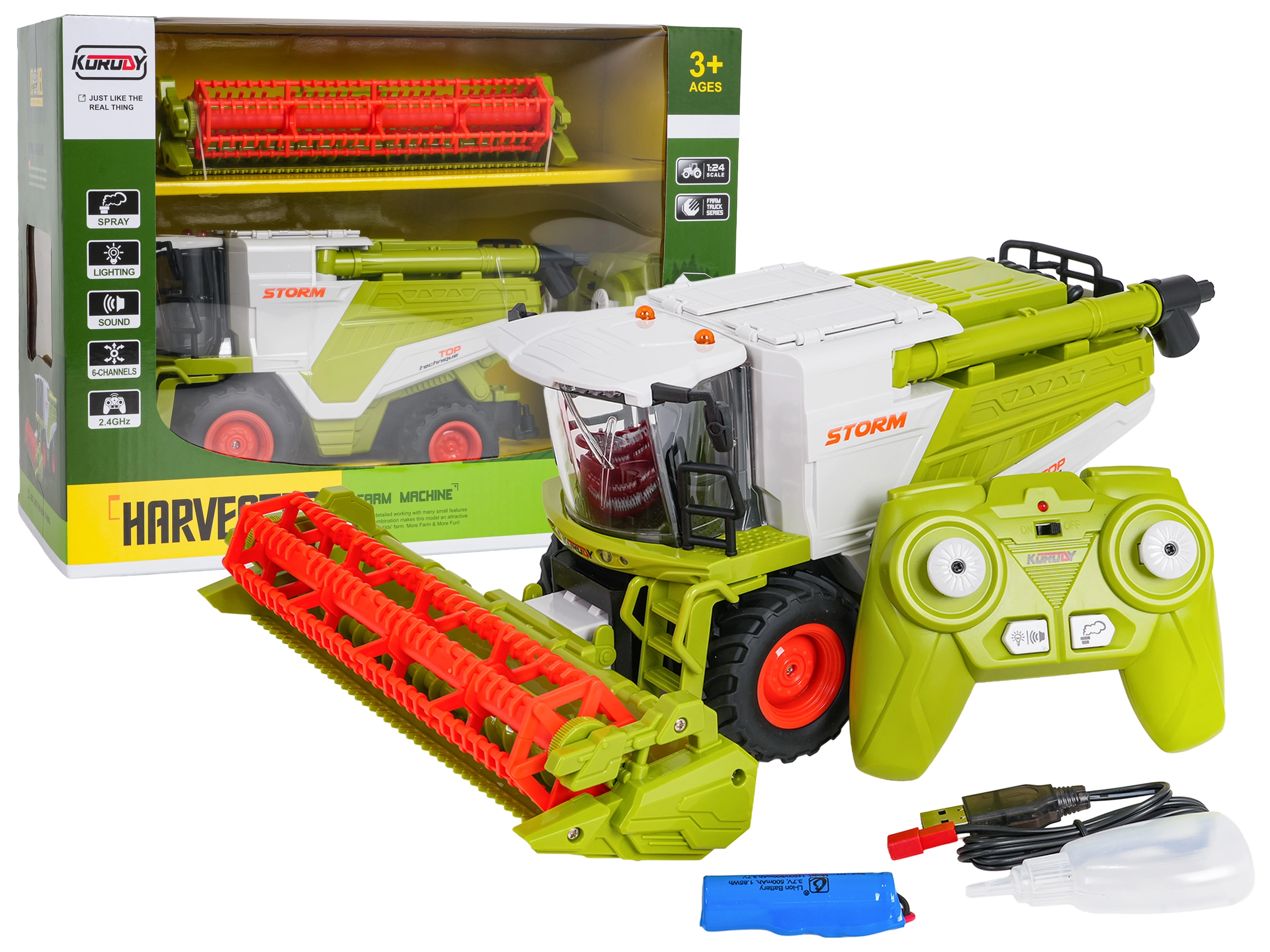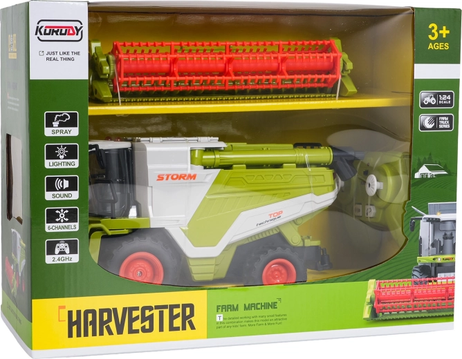 Combine RC realist la scară 1:24 încântă micii fermieri de la 3 ani. Oferă deplasare în toate direcțiile, roți din cauciuc cu aderență bună, cilindru de cosit rotativ, rezervor de boabe deschizibil și iluminare LED. Datorită efectului de fum (abur de apă) și sunetelor realiste pare o mașină adevărată. Control pe 2,4 GHz, cu opțiune de oprire a luminilor și sunetelor și adormire automată pentru economisirea bateriei.