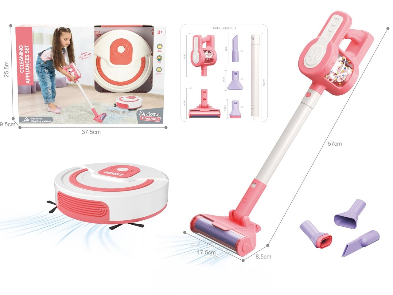 Setul de curățenie pentru copii aduce un joc de rol realist despre gospodărie și îi motivează pe cei mici să ajute la activitățile zilnice. Aspiratorul vertical cu cameră transparentă și bile în vârtej imită fidel aspirarea reală, în timp ce aspiratorul robot cu efect de aspirație și perii rotative va captiva orice copil curios.