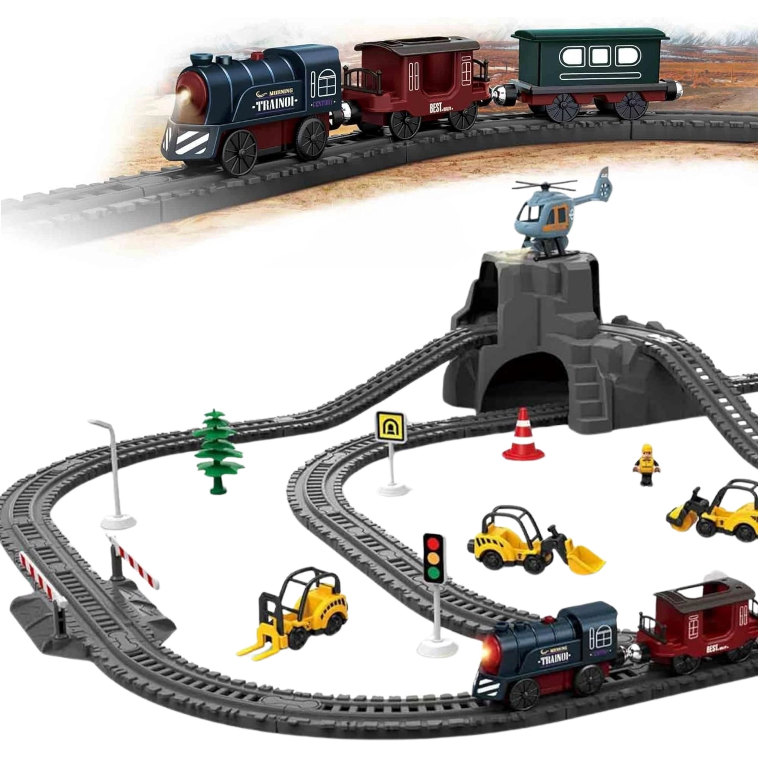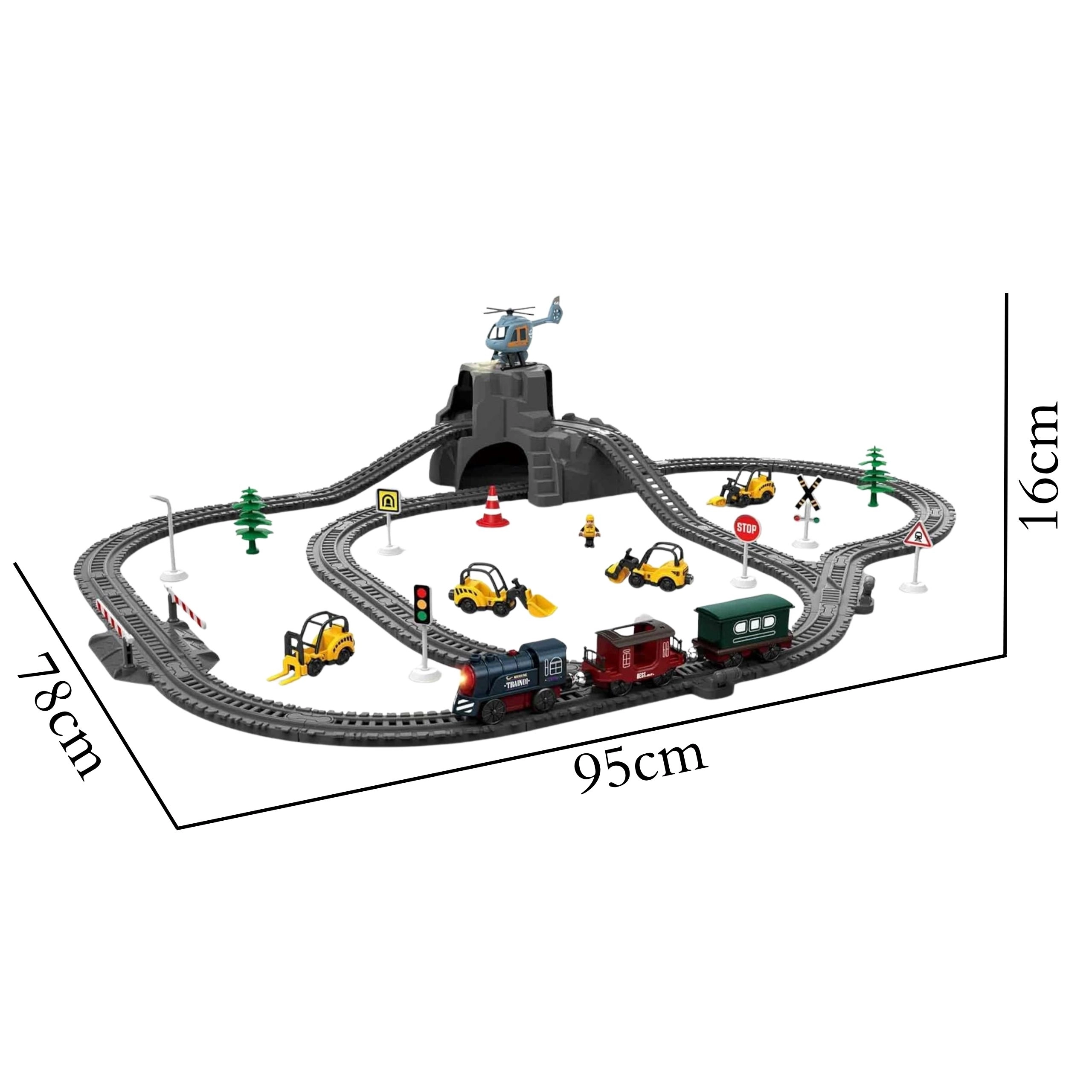 Deal cu tunel, indicatoare rutiere, bariere, copaci, figurine și vehicule de construcții adaugă jocului tensiune și atmosfera unei căi ferate reale.