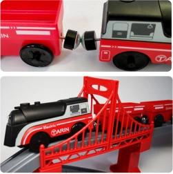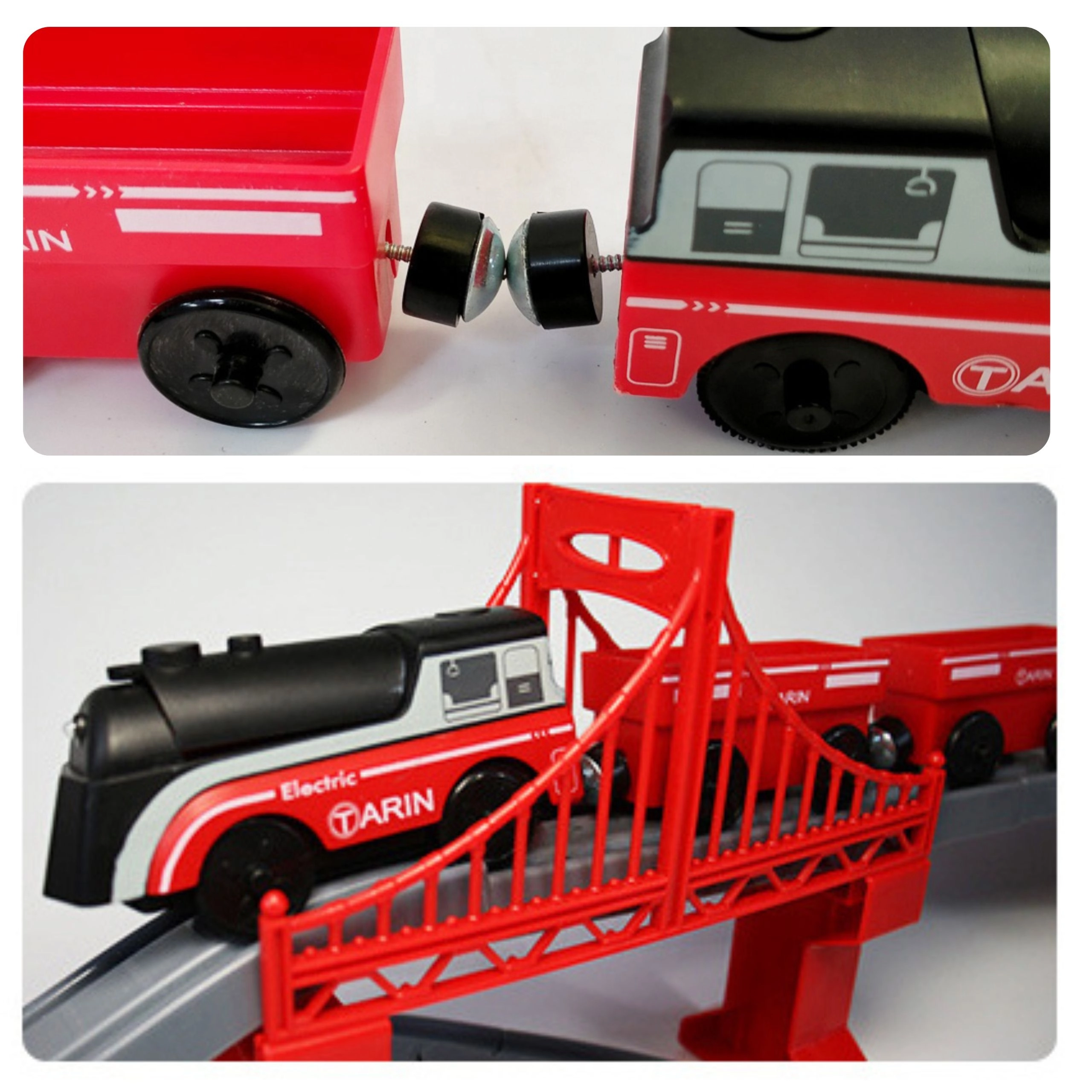 Două vagoane de marfă se atașează rapid între ele și de locomotivă datorită magneților. Materialele rezistente fac față jocului zilnic.