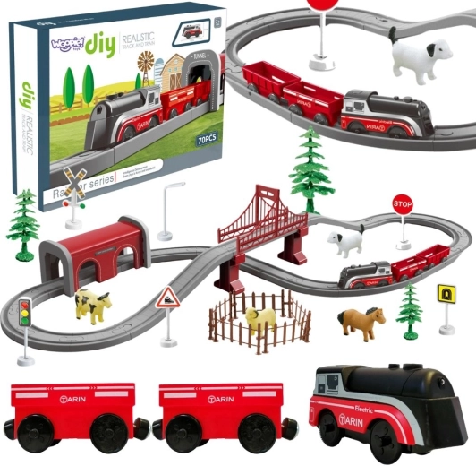 Pornește într-o plimbare pitorească prin fermă cu trenulețul electric WOOPIE într-un set bogat de 70 de piese. Locomotiva cu propulsie electrică, vagoanele magnetice și tunelul precum și podul transformă fiecare joc într-o aventură realistă. Copiii își creează propriile scene datorită animăluțelor, indicatoarelor rutiere și decorațiunilor, dezvoltând imaginația, logica și motricitatea fină.