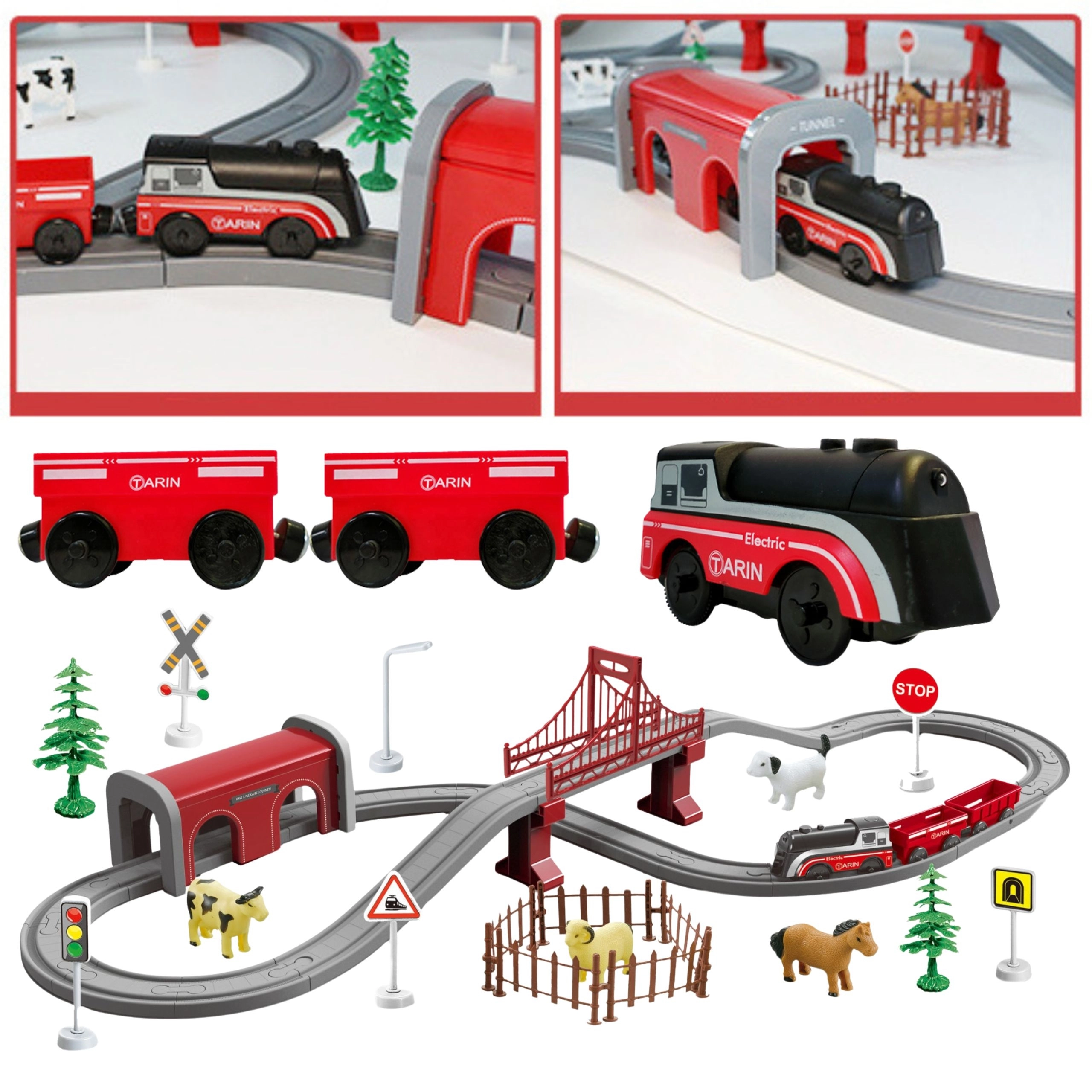 - Locomotivă electrică, 2 vagoane de marfă cu cuplaje magnetice, 20 piese de șine, 13 conectori, 2 suporți pentru pod, 3 piese de pod, 5 piese de tunel, 5 indicatoare rutiere, 1 stâlp de lampă, 6 baze, 2 copaci, figurină cal, câine, berbec și vacă, 5 garduri, autocolante, ghid cu propuneri de trasee