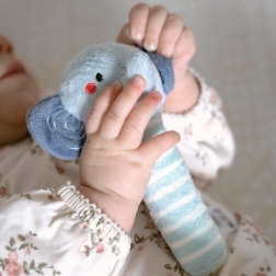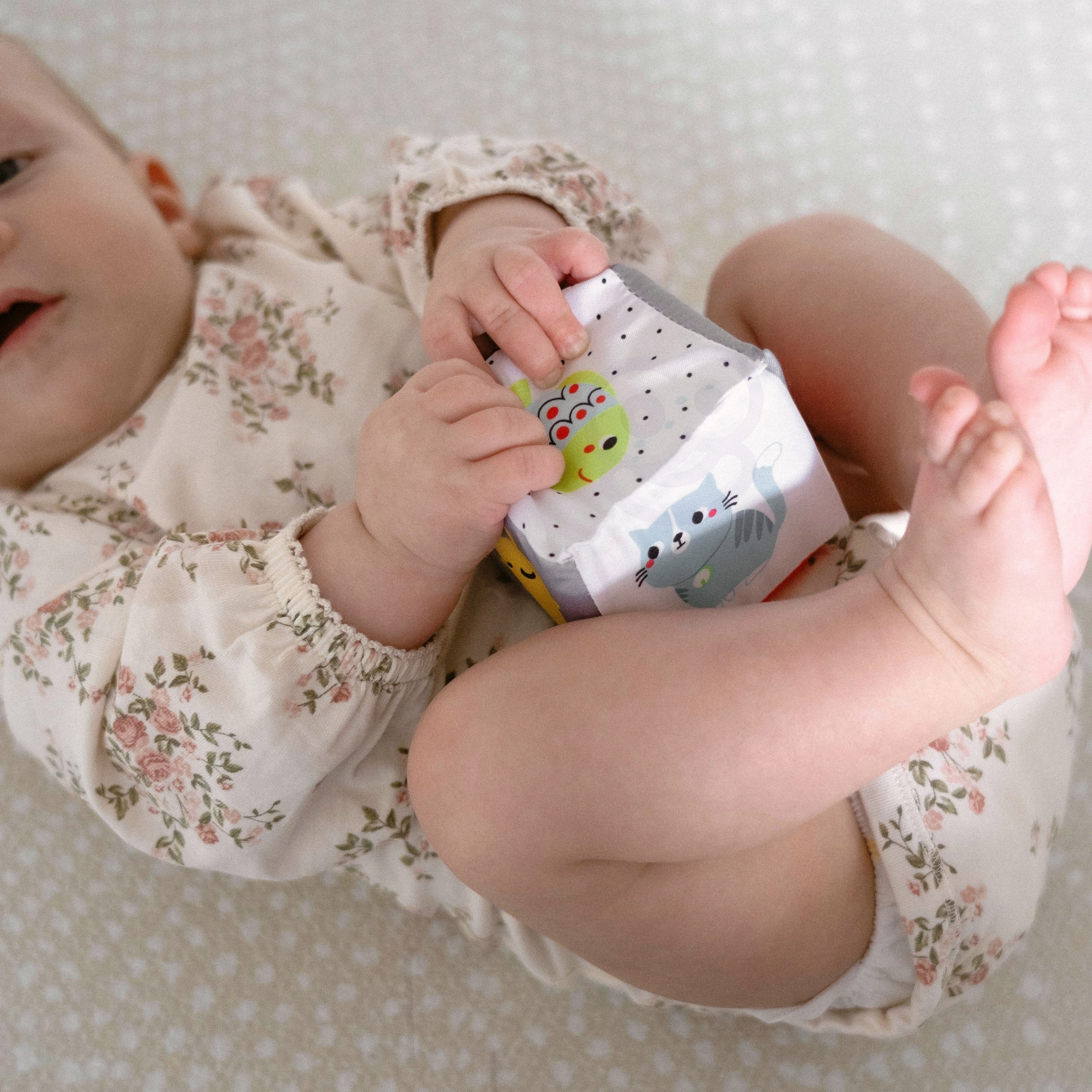 Sunt incluse: cuburi moi active (4 buc) cu clopoței, disc rotativ din lemn pentru prindere și rostogolire, „oglindă misterioasă” cu contrast ridicat pentru joaca pe burtică, zornăitoare/rolly colorate din lemn, tub de ploaie cu biluțe și o zornăitoare–rozătoare moale în formă de animăluț. Setul este ideal ca dar pentru proaspeții părinți – oferă o stimulare senzomotorie variată și joacă liniștită, concentrată.