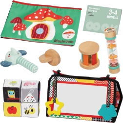 - 4× cub moale activ cu clopoței; disc rotativ din lemn; jucărie tip oglindă cu contrast ridicat; zornăitoare/rolly colorată din lemn; tub de ploaie; zornăitoare–rozătoare moale