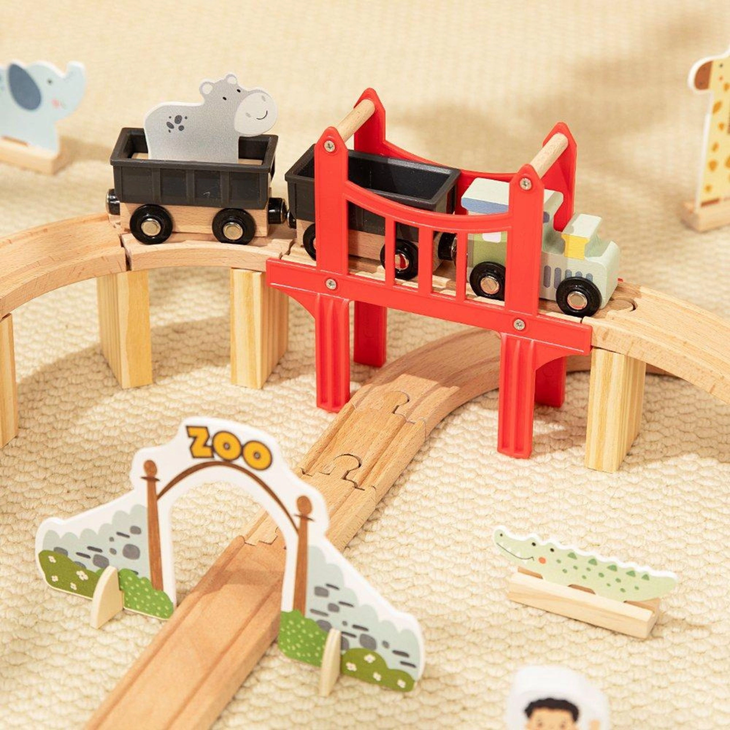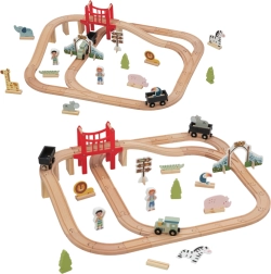 Setul este conceput atât pentru distracție, cât și pentru dezvoltarea abilităților: asamblarea șinelor, manipularea figurinelor și planificarea rutei susțin creativitatea, coordonarea mână–ochi și răbdarea. Construcția de calitate din lemn asigură durabilitate și o viață lungă a produsului, iar setul este compatibil cu majoritatea căilor ferate din lemn populare.