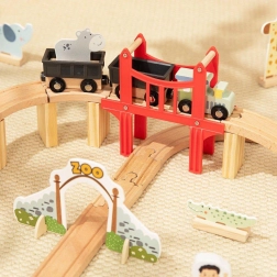 Calea ferată din lemn Woopie Green aduce farmecul grădinii zoologice în camera copilului și ore întregi de joc creativ. Trenulețul cu vagoane unite prin magneți trece pe lângă girafă, elefant, leu și zebre, traversează un pod înălțat și intră prin poarta de acces. Datorită șinelor variabile, copiii își pot aranja cu ușurință traseul exact după imaginația lor.