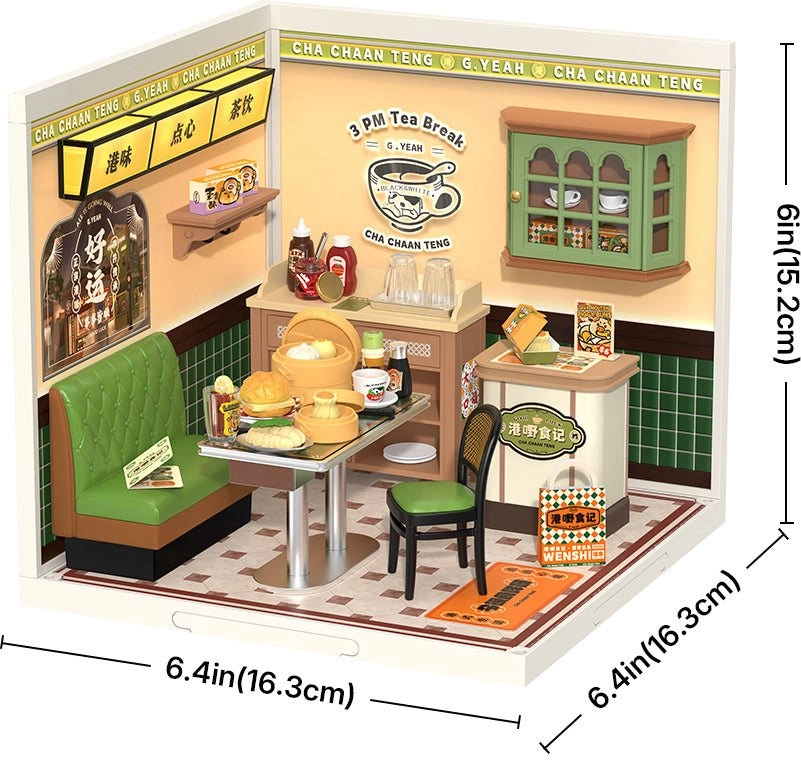 Descoperă farmecul unei cafenele tradiționale din Hong Kong în miniatură cu modelul Rolife căsuță DIY: cafenea din Hong Kong. Setul cu 114 piese și iluminare LED oferă asamblare ușoară (dificultate 1/5) în aproximativ 1 oră și aduce detalii autentice precum canapea verde din piele, căruț de servire și delicatese iconice, inclusiv dim sum, chifle cu ananas și ceai cu lapte.