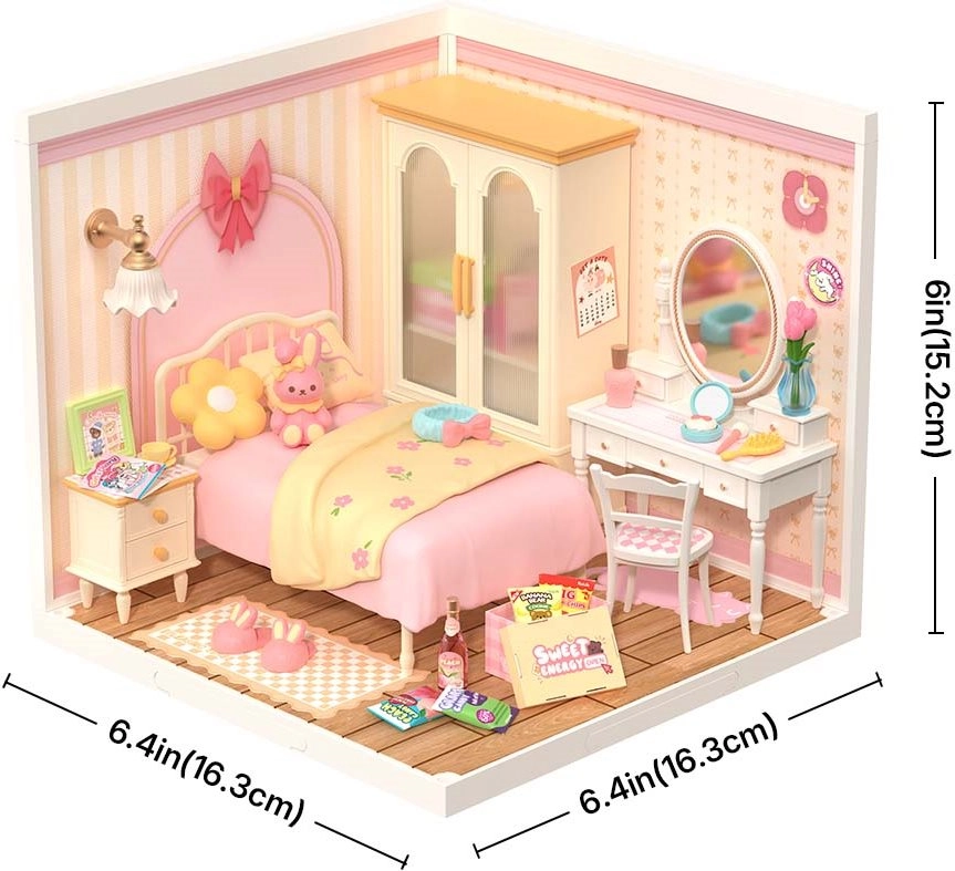Acest mini-dormitor superb, în tonuri pastel, aduce tot ce apreciază iubitorii de miniaturi: pat cu textile, măsuță de toaletă cu oglindă, noptieră, dulap încastrat și numeroase accesorii mărunte. Iluminarea LED caldă creează o atmosferă plăcută și evidențiază finisajele detaliate ale mobilierului și decorațiunilor.