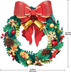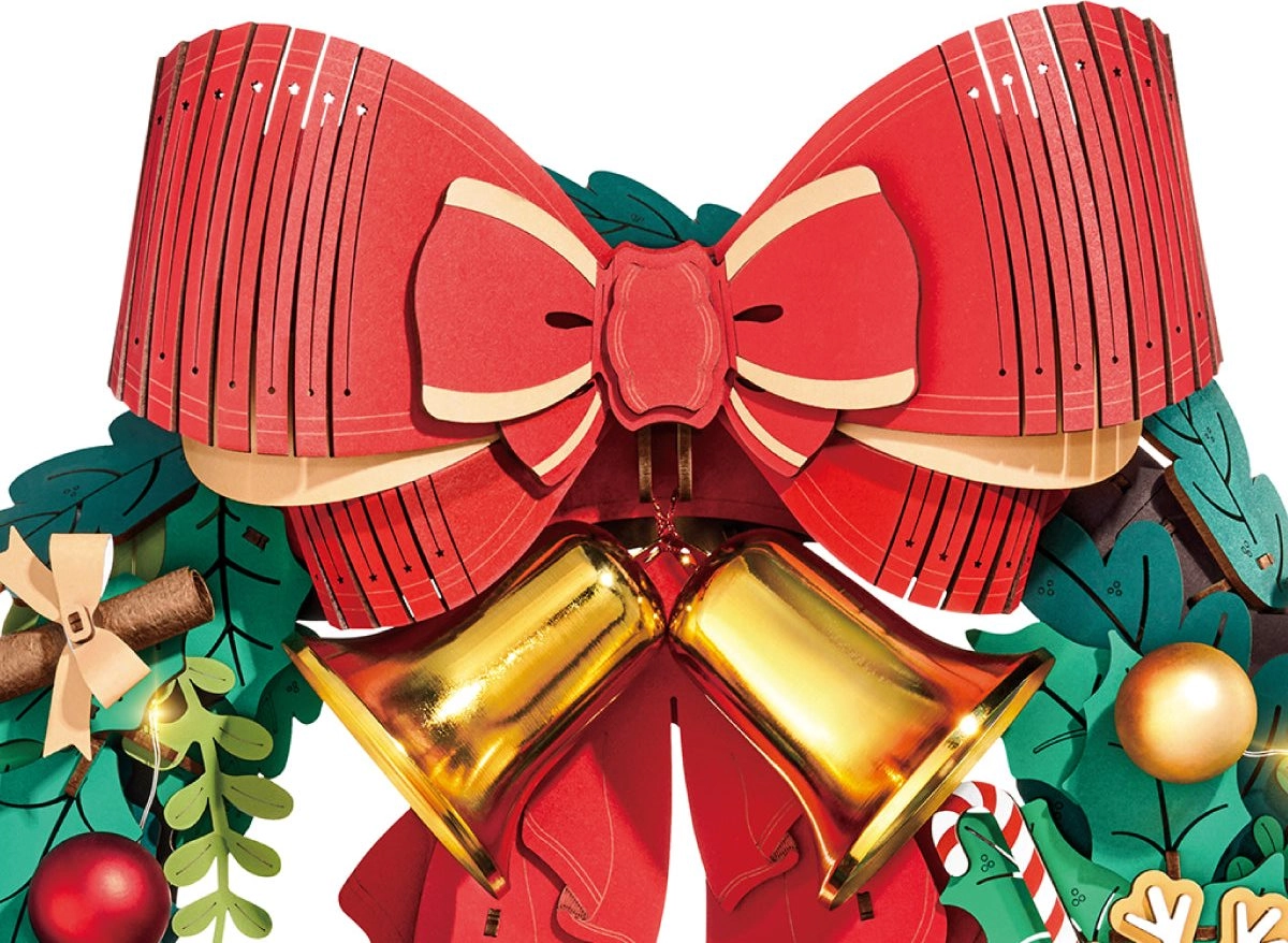 Această coroniță de Crăciun elegantă îmbină motive tradiționale cu distracția modernă DIY. Crenguțele verzi sunt completate de decorațiuni precum ilex, bobițe, conuri, fulgi de zăpadă, turtă dulce, cadouri și iconica fundă mare roșie cu clopoței aurii. LED-urile integrate intensifică atmosfera festivă și transformă modelul final într-o decorațiune unică pentru ușă sau perete.