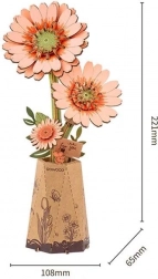 Asamblează o elegantă gerberă portocalie din piese din lemn decupate cu precizie laser. Modelul dezvoltă motricitatea fină, gândirea spațială și răbdarea. Piesele sunt numerotate, fără necesar de lipici și se fixează ferm prin îmbinare. Este inclus ghid ilustrat; asamblarea durează aproximativ 30 de minute.