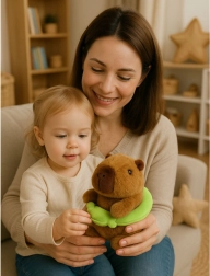 Această capibară de pluș maro este realizată din pluș fin, de calitate și umplută cu material hipoalergenic pentru confort maxim și siguranță la joacă și somn. Colacul verde detașabil cu broscuță zâmbitoare stimulează joaca creativă și dezvoltă imaginația copiilor.