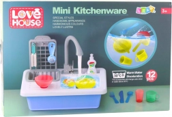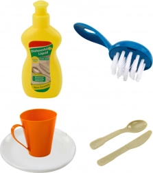 - Chiuvetă cu robinet și circuit de apă, farfurie verde, bol roz, 3× pahar, cuțit, lingură, furculiță, perie pentru vase, răzuitoare/spatulă, sticlă cu „detergent”
