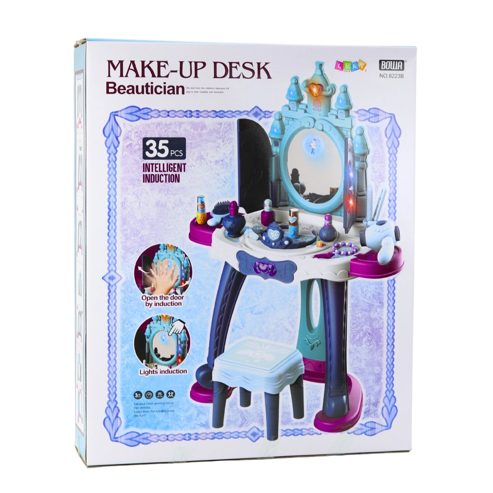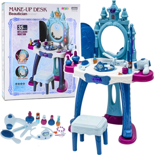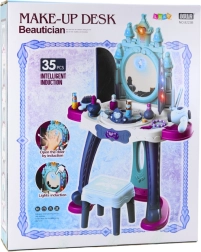 Măsuța de toaletă interactivă Prințesele Înghețului aduce copiilor atmosfera unui adevărat budoar regal. La apropiere, ușițele se deschid și dezvăluie oglinda pe care apar personaje ale prințeselor. Luminile LED amplasate în partea superioară, pe lateralele oglinzii și pe ușițe creează o iluminare delicată, în timp ce melodiile magice stimulează imaginația și invită la joacă.