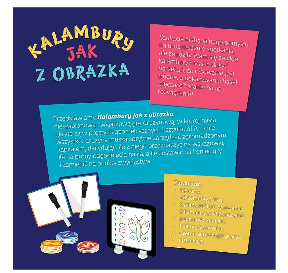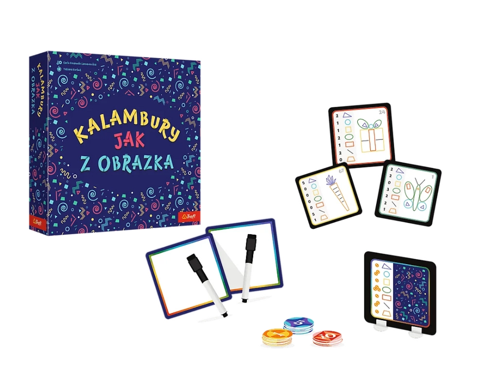 Descoperă jocul de echipă original în care parolele sunt ascunse în forme simple. Cu ajutorul pieselor geometrice creezi imagini și îți conduci echipa spre soluție. Creativitate, strategie și distracție pentru toată familia – acesta este Kalambury: ca în imagine de la Trefl.