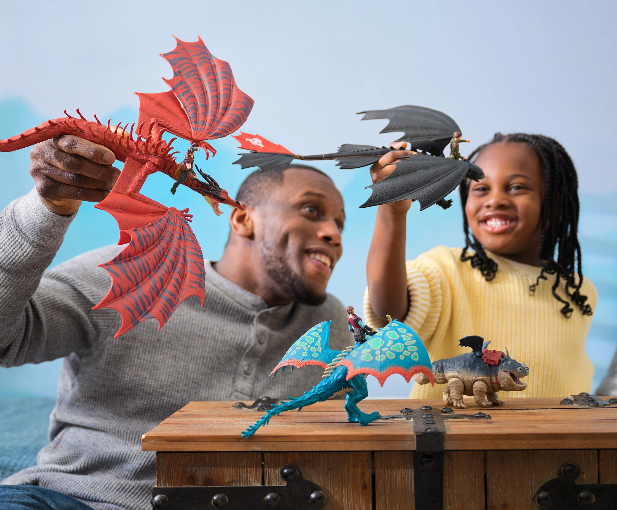 Figurinele Hiccup, Astrid și Snotlout (aprox. 7,5 cm) se fixează ușor în șeile dragonilor datorită mecanismelor sigure pentru o călărie stabilă.