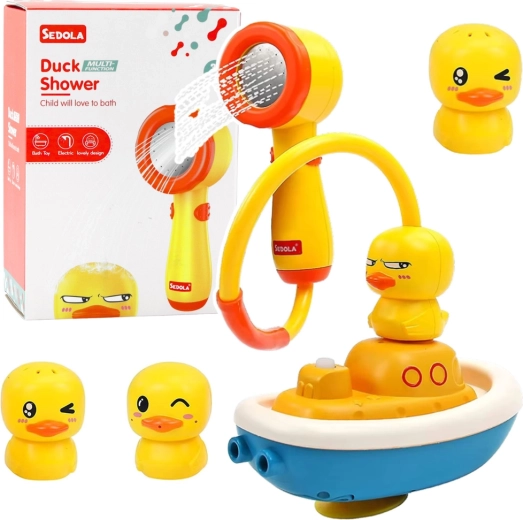 Un set de baie distractiv cu rățușcă și accesoriu de duș electric transformă fiecare îmbăiere într-un joc. Datorită pompei pe baterii, pulverizează apa ca un duș adevărat, bărcuța plutitoare și capetele interschimbabile ale rățuștelor susțin jocul creativ, motricitatea fină și relația pozitivă cu apa. Realizat din plastic sigur, cu forme plăcut rotunjite și culori vii pentru bucurie și siguranță.