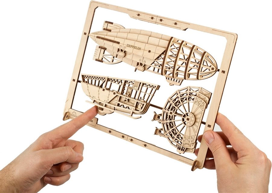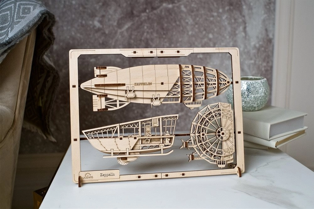 Puzzle-ul 3D din lemn UGEARS Zeppelin 2,5D îmbină materialul tradițional cu mișcarea mecanică. Asamblarea este intuitivă și plăcută – piesele sunt tăiate cu laser cu precizie și se desprind ușor din plăci, astfel că nu este necesar niciun adeziv pentru montaj. După asamblare obții un model detaliat de dirijabil cu gondolă și elice, care devine o decorațiune originală și un instrument educativ.