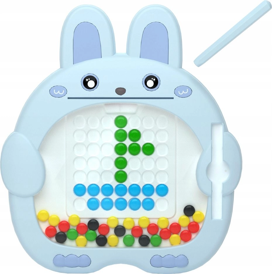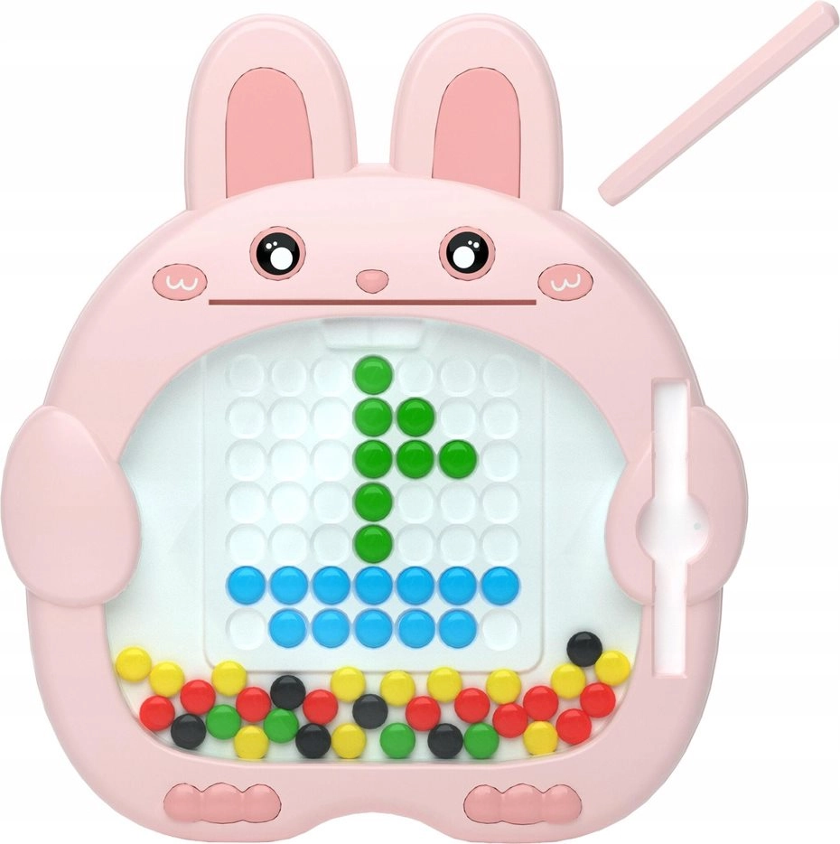 Această tablă magnetică creativă în formă de iepuraș drăguț îi va captiva pe copii pentru mult timp. Stiloul magnetic ridică și mută cu ușurință nasturii colorați în grilă, astfel încât copiii pot crea imagini pas cu pas după modelele incluse sau complet din imaginație.