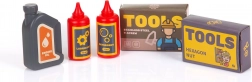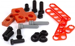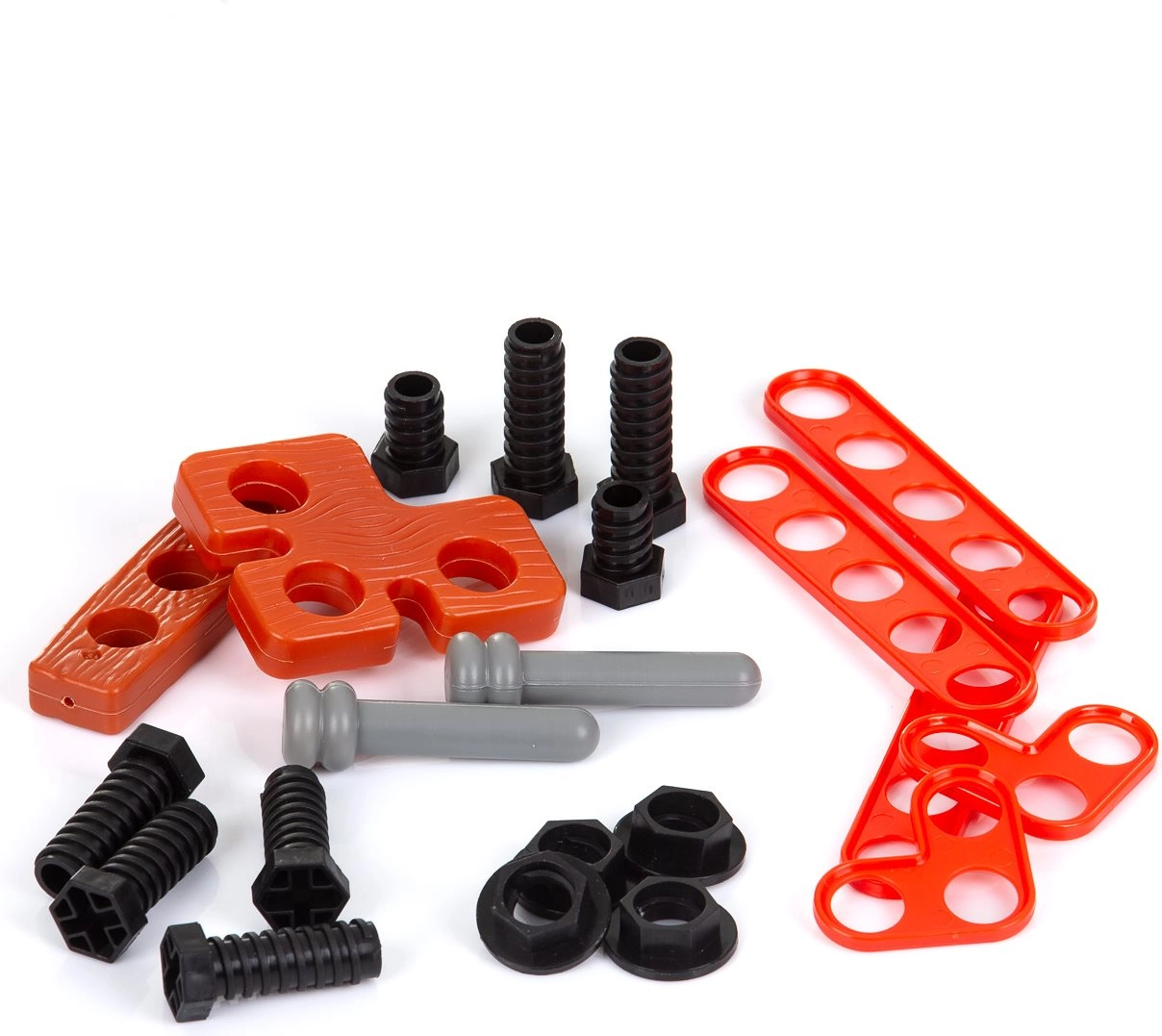 Sunt incluse instrumente pentru copii și piese de îmbinare pentru înșurubare, asamblare și exersarea îndemânării și imaginației.