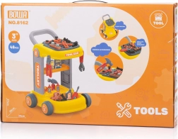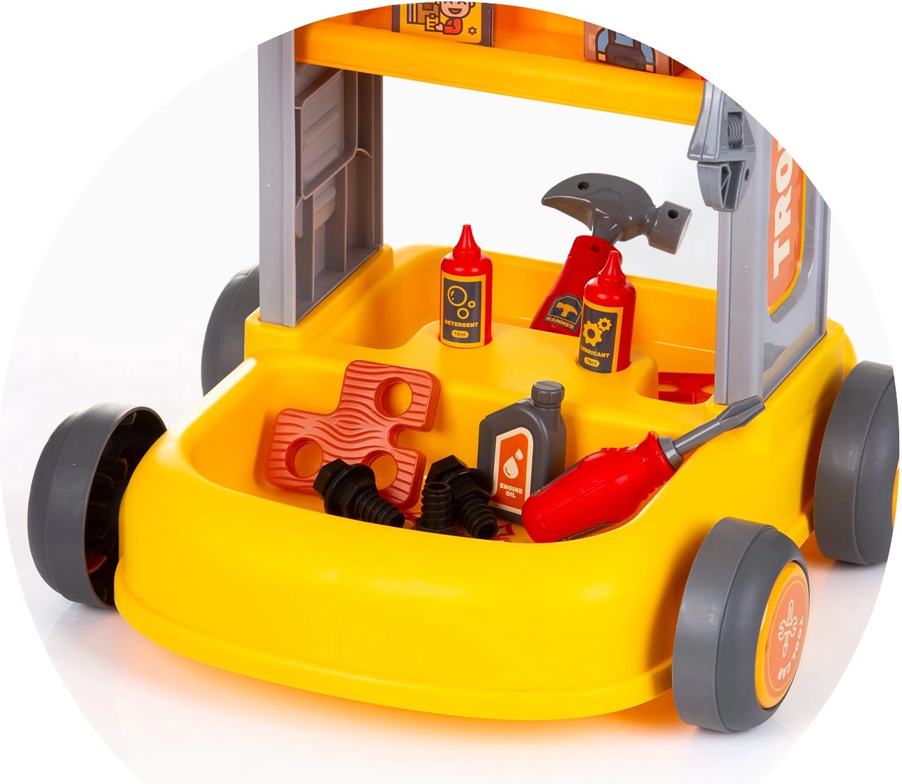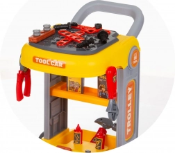 Un cărucior distractiv și practic cu unelte pentru mici meșteri care dezvoltă motricitatea fină, creativitatea și gândirea tehnică. Cărucior stabil pe roți, cu mâner și accesorii bogate, oferă numeroase posibilități pentru un joc realist de atelier. Fabricat conform standardelor europene de siguranță.
