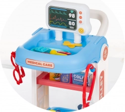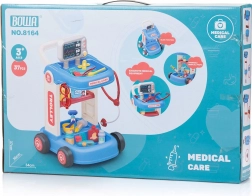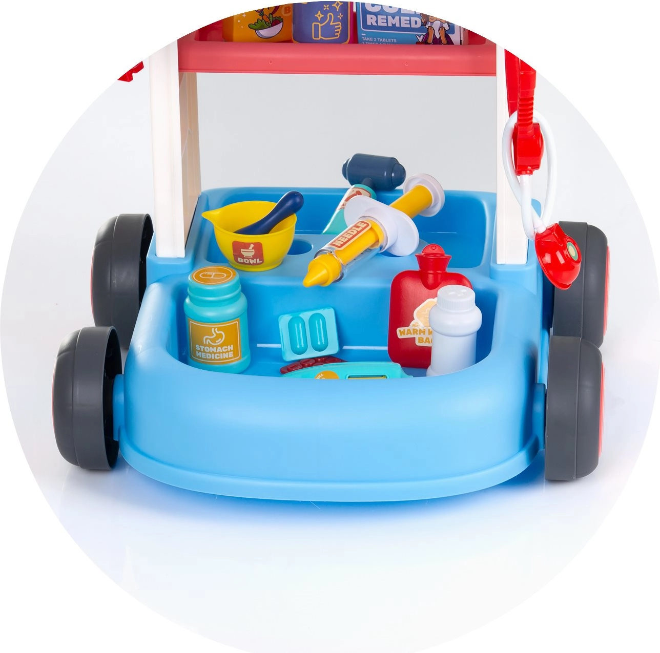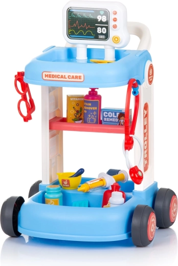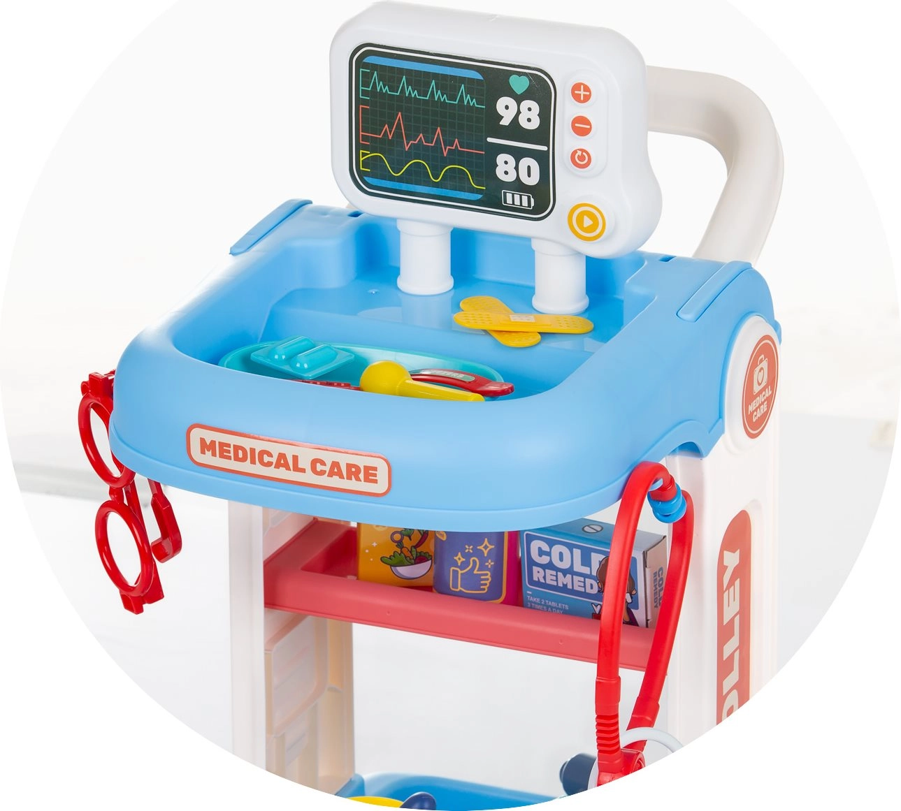 Acest set medical pentru copii, cu cărucior mobil, oferă tot ce are nevoie un mic doctor pentru primele sale consultații. Structura stabilă, cu roți și mâner, permite mutarea ușoară prin cameră, în timp ce rafturile și compartimentele mențin toate instrumentele la îndemână și bine organizate. Datorită echipării bogate, copiii pot încerca proceduri medicale de bază și își pot exersa empatia și abilitățile de comunicare.
