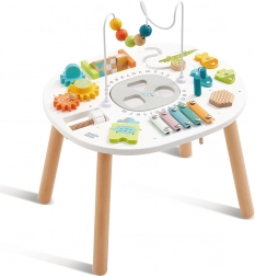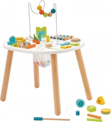 Pe blatul mesei, copiii descoperă stații variate: labirint cu mărgele pe sârmă, xilofon cu baghetă, roți dințate rotative, joc de pescuit magnetic, sortator de forme și alte elemente inteligente pentru antrenarea logicii, răbdării și coordonării. Datorită multiplelor activități într-un singur loc, colțul de joacă rămâne ordonat, iar copiii se concentrează cu ușurință.