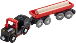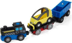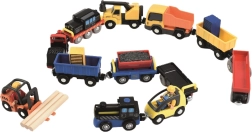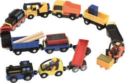 Locomotiva cu vagon de cărbune și vagon pentru bușteni îi introduce pe copii în lumea feroviară. Decuplarea și cuplarea vagoanelor dezvoltă motricitatea fină și jocul imaginativ.