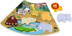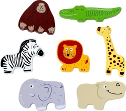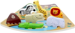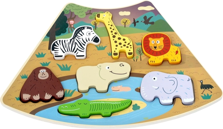 Puzzle-ul din lemn Safari este o jucărie ideală pentru primele activități de potrivire. Figurinele colorate și drăguțe ale animalelor – zebra, girafă, leu, gorilă/orangutan, hipopotam, elefant și crocodil – au forme groase, ușor de prins, care le fac ușor de manevrat de către copii. Baza cu scenă de savană ajută la percepția spațială și la recunoașterea formelor, deoarece fiecare piesă are locul ei exact.