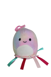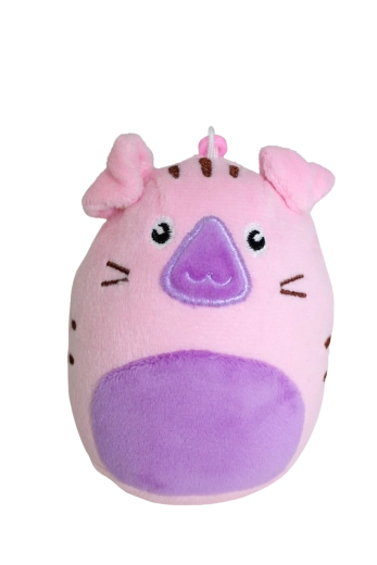 Purcelușul roz cu burtică mov și față brodată este foarte moale, sigur și ideal pentru îmbrățișat și joacă.