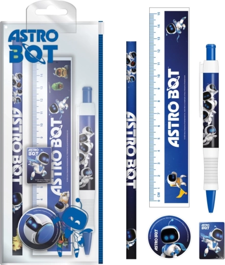 Set școlar practic cu licență Astrobot, conține tot ce ai nevoie pentru scris și măsurare. Într-o trusă compactă din plastic găsești riglă de 15 cm, ascuțitoare, radieră, stilou cu bilă și creion HB – ideal pentru școală și călătorii.