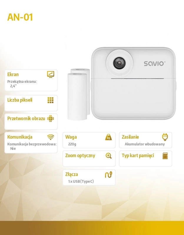 Aparatul foto pentru copii SAVIO AN‑101 îmbină operarea simplă cu dotări bogate pentru distracție creativă. Imprimarea termică permite tipărirea imediată a fotografiilor alb-negru fără costuri de cerneală. Obiectivul ultra‑grandangular cu unghi de vizualizare de 90° și rezoluție de până la 48 MP oferă imagini și videoclipuri clare și detaliate.