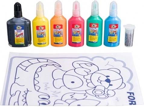 Culorile sunt intense (roșu, portocaliu, galben, verde, albastru și negru), se aplică ușor și susțin motricitatea fină, creativitatea și imaginația. Poți crea folosind șabloanele sau complet fără șablon.