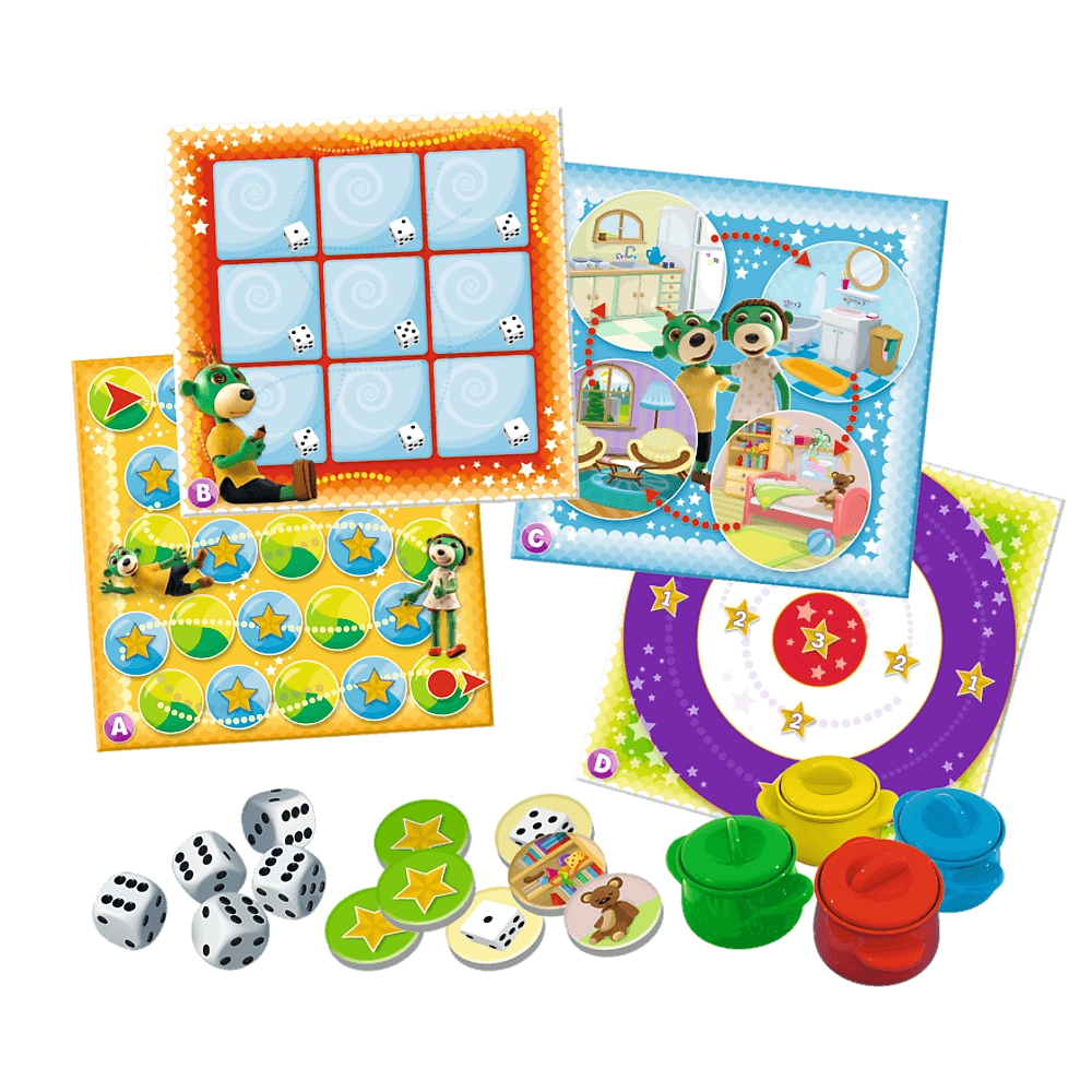 - 2 planșe de joc față-verso, 4 cănuțe din plastic (pioni), 12 jetoane cu zaruri, 12 jetoane cu obiecte de uz casnic, 5 zaruri, instrucțiuni