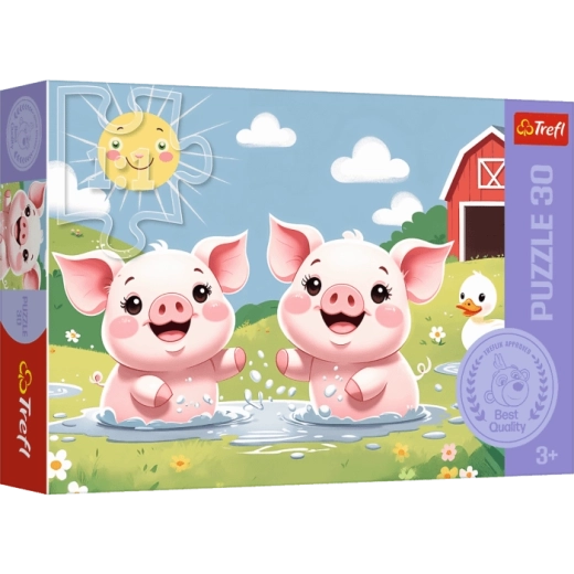Puzzle-urile pentru copii Trefl cu motivul „Viața veselă la țară” oferă 30 de piese care, după asamblare, creează o imagine cu dimensiunile 270 × 200 mm cu două purcelușe. Datorită materialelor de calitate, asamblării ușoare și producției ecologice în Polonia, sunt o alegere ideală pentru copiii de la 3 ani, susținând motricitatea fină și imaginația.