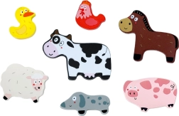 Puzzle-ul din lemn Ferma veselă oferă o bază solidă cu ilustrație colorată a fermei și 7 piese masive, rotunjite, cu animăluțe (vacă, oiță, cal, porc, câine, rață, găină). Piesele groase sunt ușor de ținut de către copii și se potrivesc perfect în deschiderile frezate, susținând în mod natural dezvoltarea motricității fine și a concentrării.